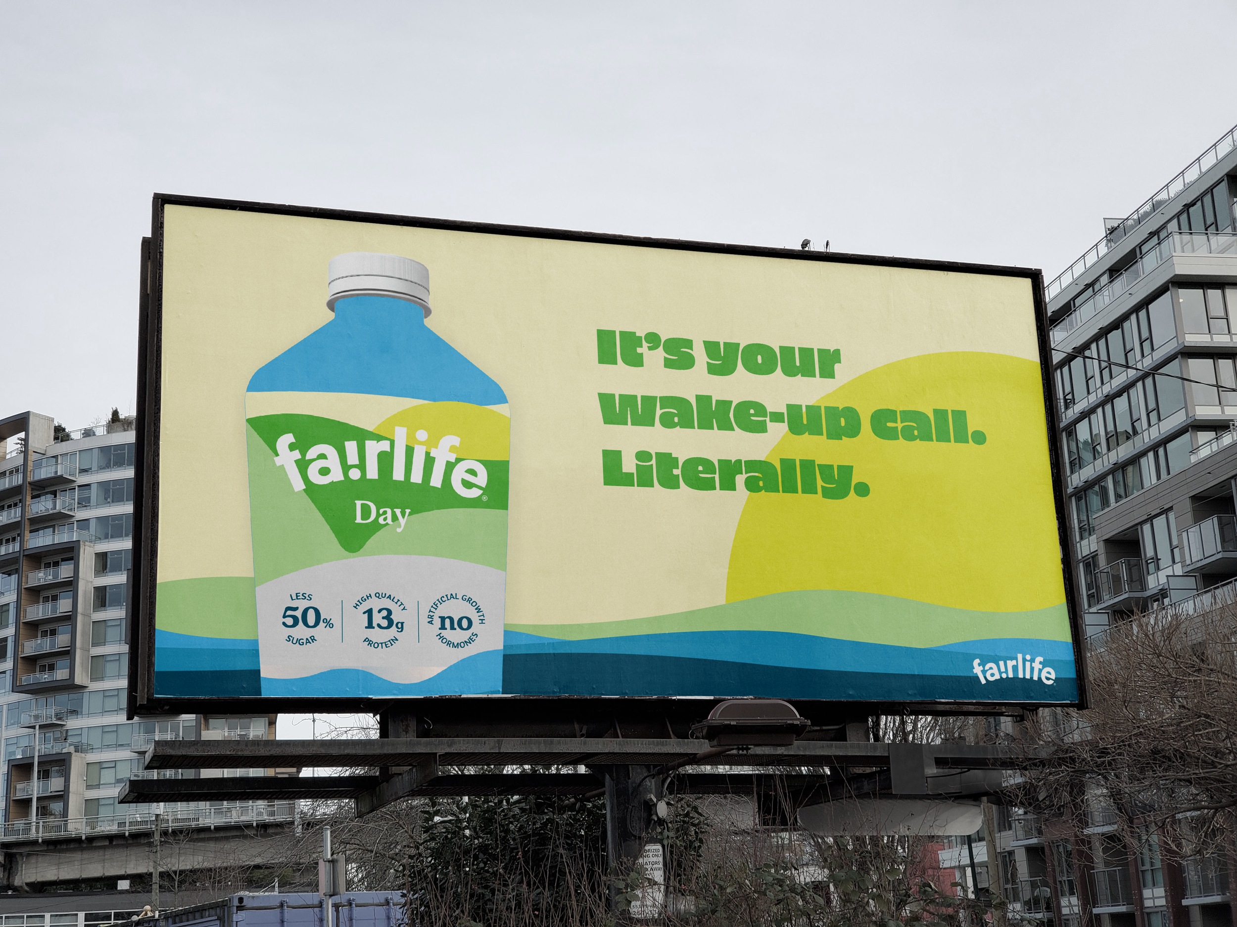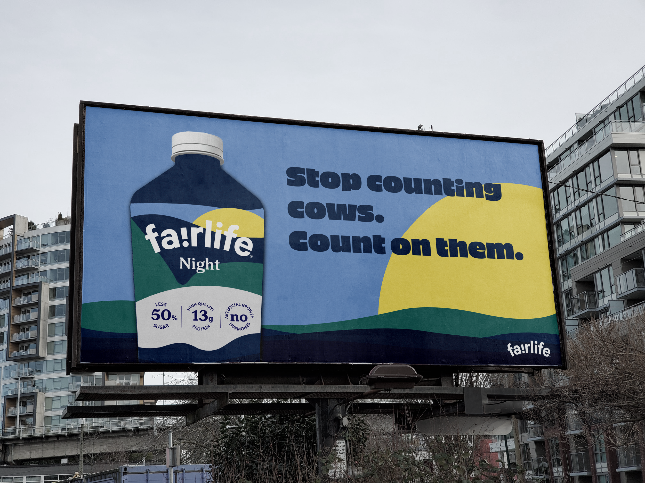 How: By designing new packaging for Fairlife milk bottles, we divide the same product into two: Day and Night, creating a category disruption and driving a conversation: does the taste differ? We complement the new look with merchandise and a full awareness campaign with OOH billboards timed to change at sunset and sunrise, news takeovers, timed social ads, and retail promo.